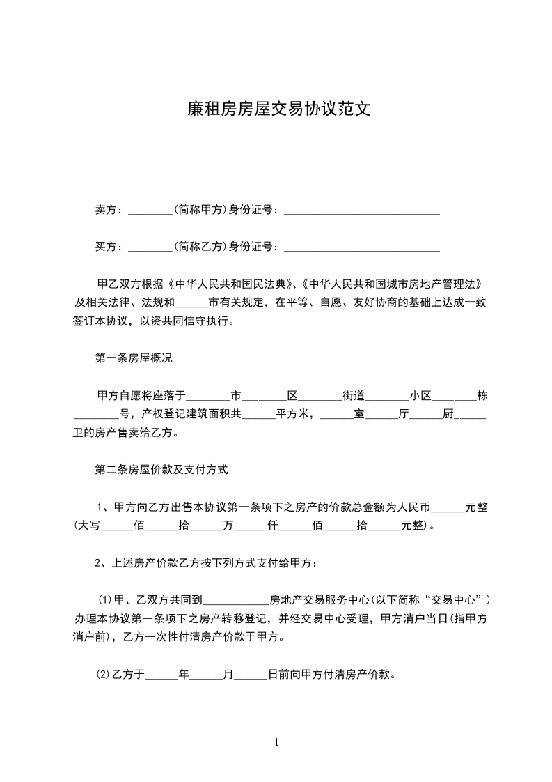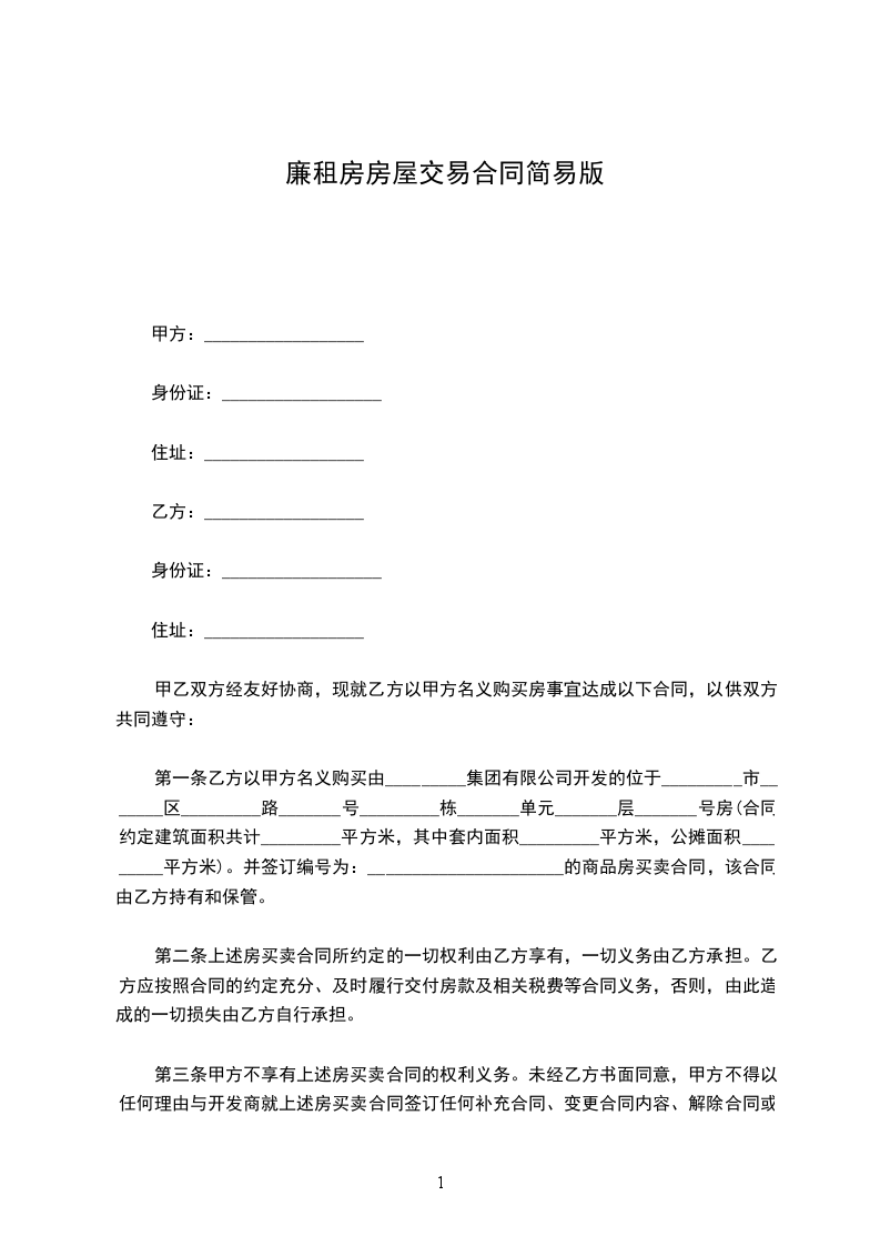 第一条、乙方购买甲方坐落在___________________________________,私有楼房住宅一处,建筑面积为___________________(以产权登记面积为准)。