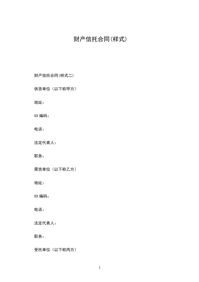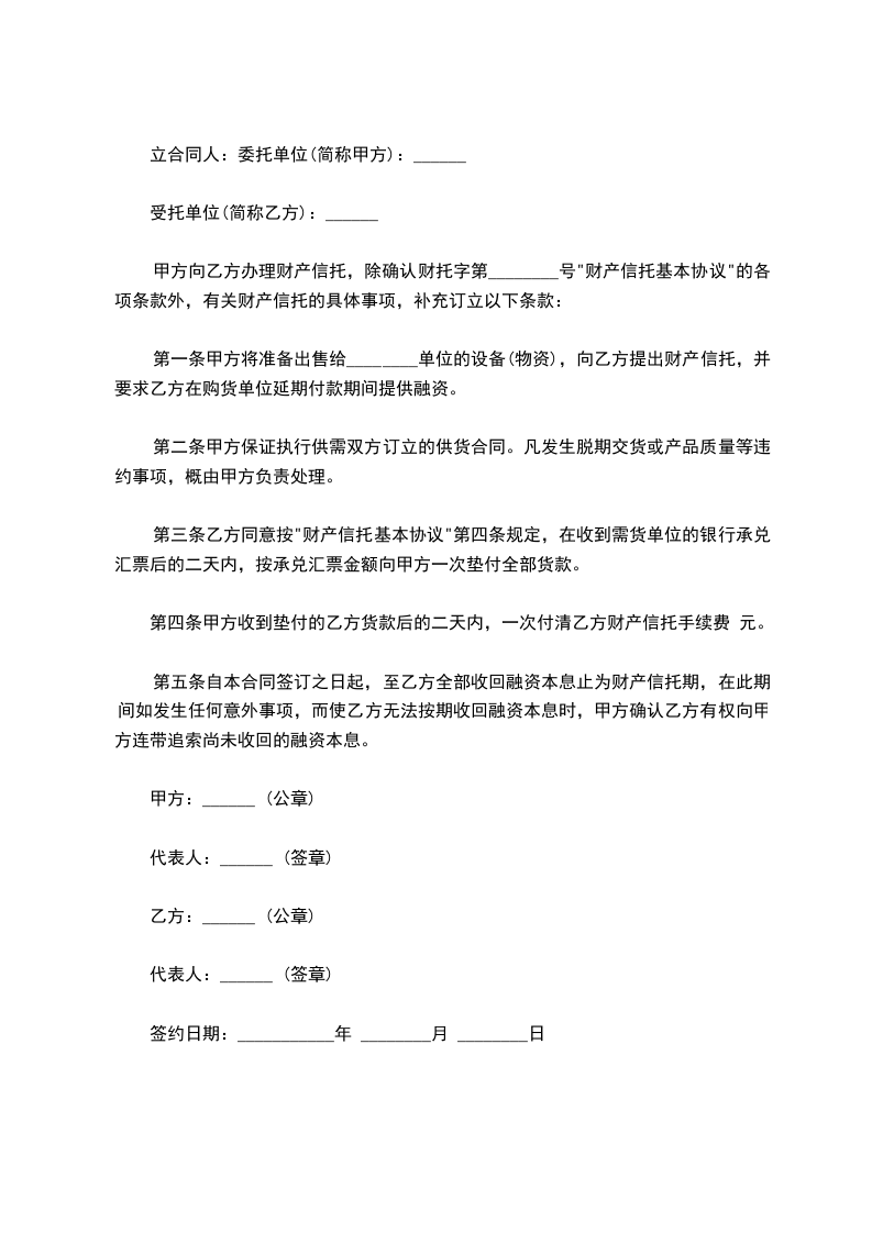 第一条甲方将准备出售给 单位的设备(物资),向乙方提出财产信托,并要求乙方在购货单位延期付款期间提供融资。