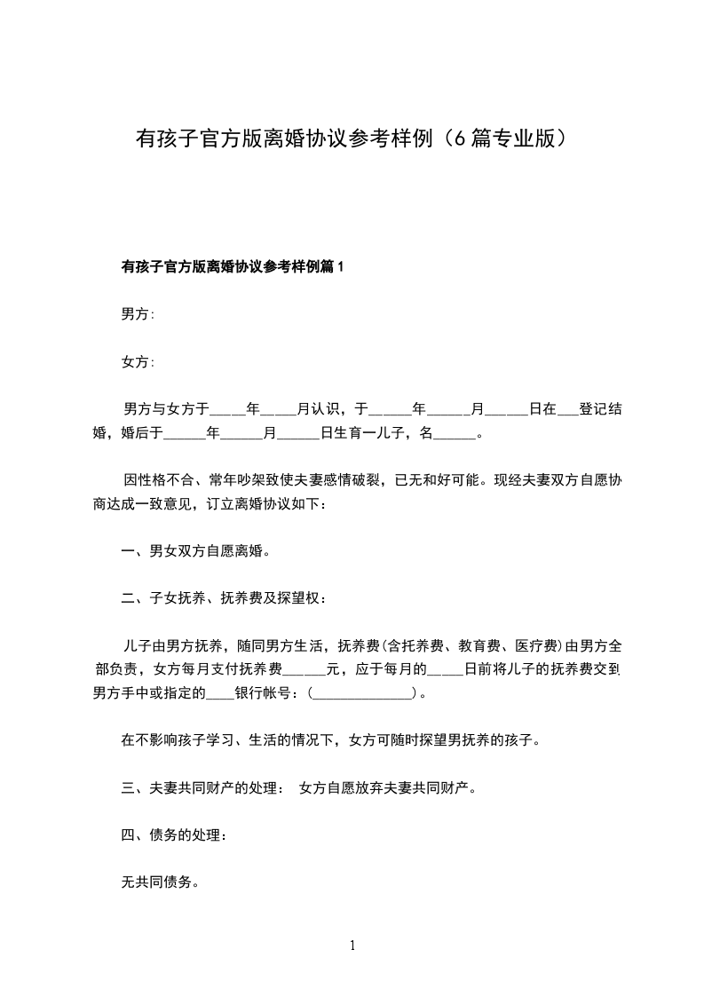 双方于________年________月________日在________________人民政府的民政部门登记结婚,婚后一个子女,因双方性格不和,无法共同生活,自愿离婚,经双方协商一致,订立离婚协议如下: