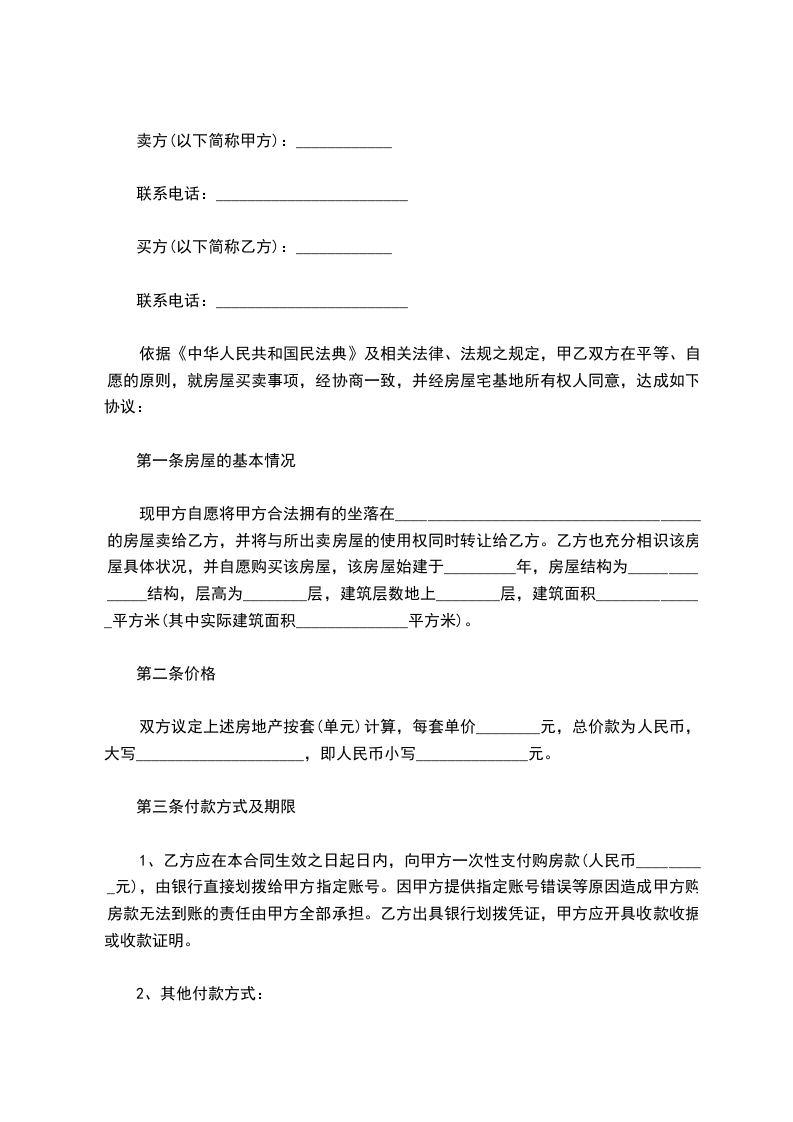 依据《中华人民共和国民法典》及相关法律、法规之规定,甲乙双方在平等、自愿的原则,就房屋买卖事项,经协商一致,并经房屋宅基地所有权人同意,达成如下协议: