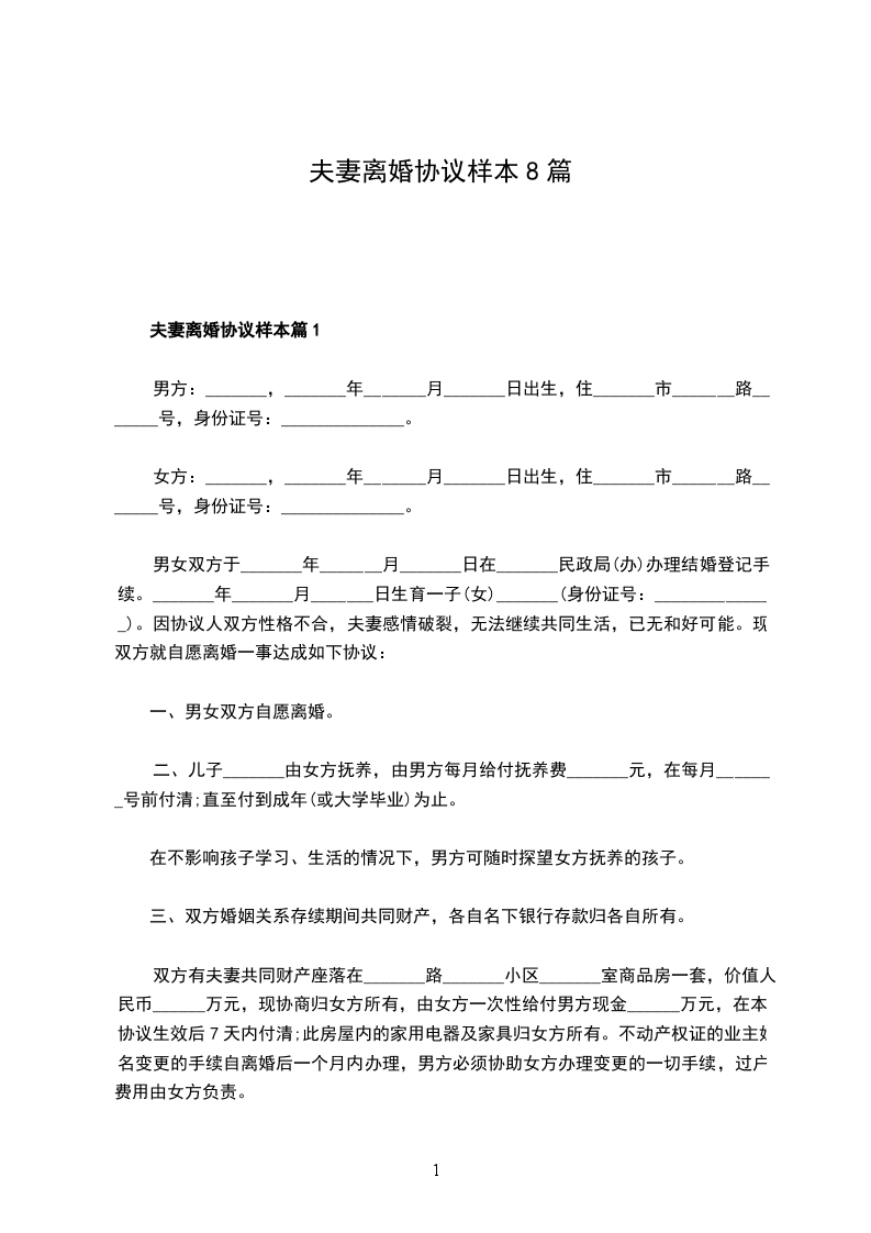 男女双方于_______年_______月_______日在_______民政局(办)办理结婚登记手续。_______年_______月_______日生育一子(女)_______(身份证号:______________)。因协议人双方性格不合,夫妻感情破裂,无法继续共同生活,已无和好可能。现双方就自愿离婚一事达成如下协议: