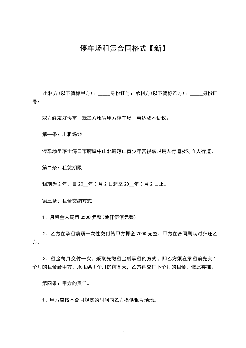 2、费用标准:车辆停放费为 _______元/车位/月,每半年缴纳一次。