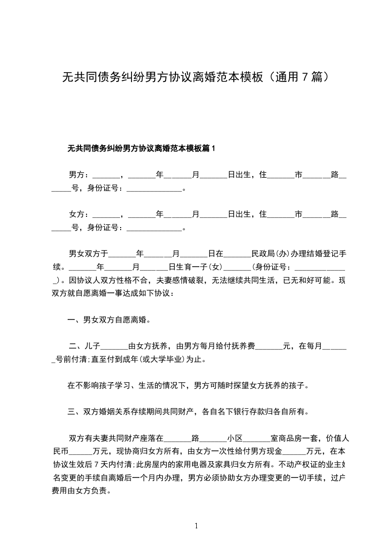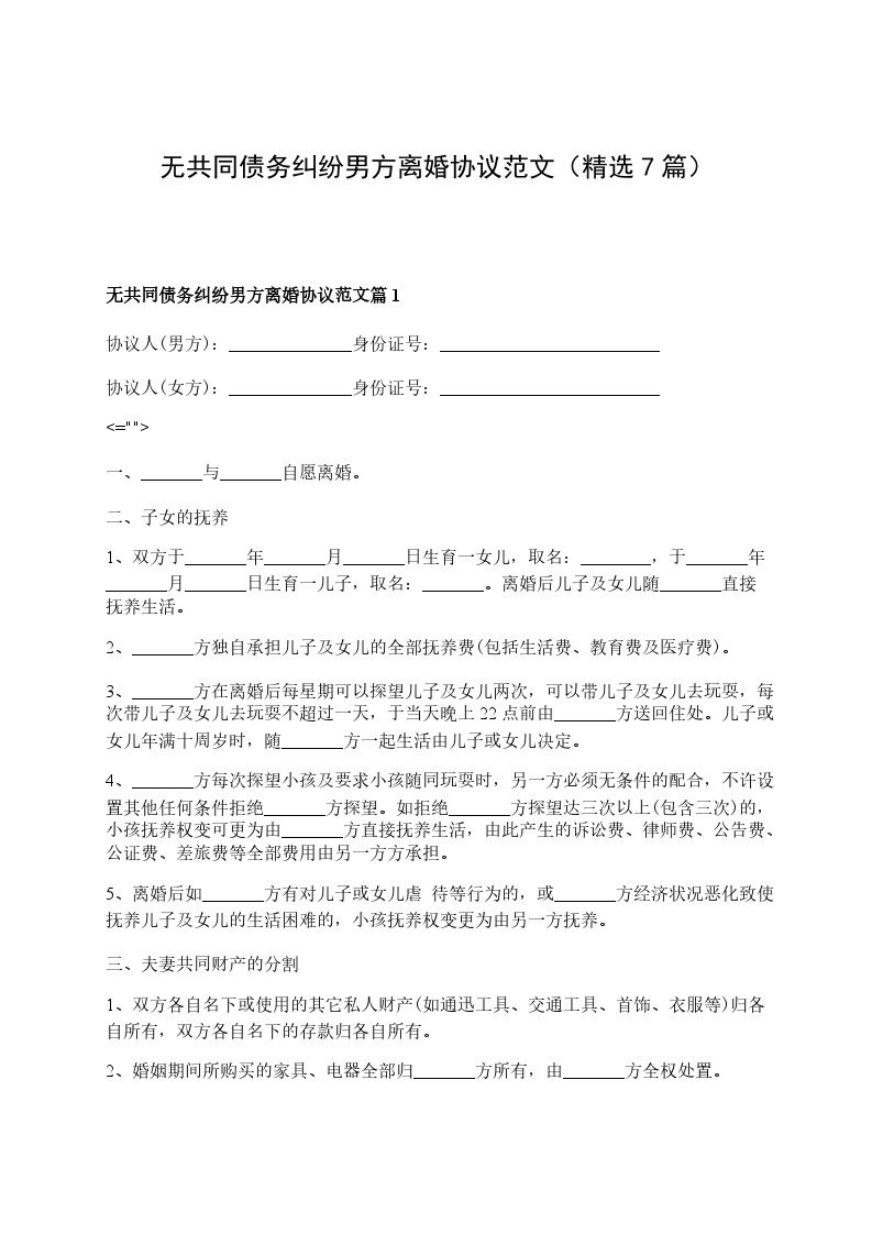 无共同债务纠纷男方离婚协议范文篇7