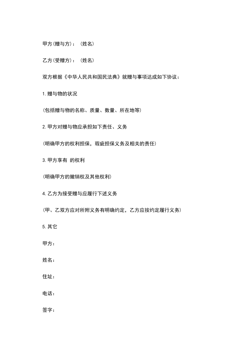 双方根据《中华人民共和国民法典》的规定,就赠与事项达成协议如下: