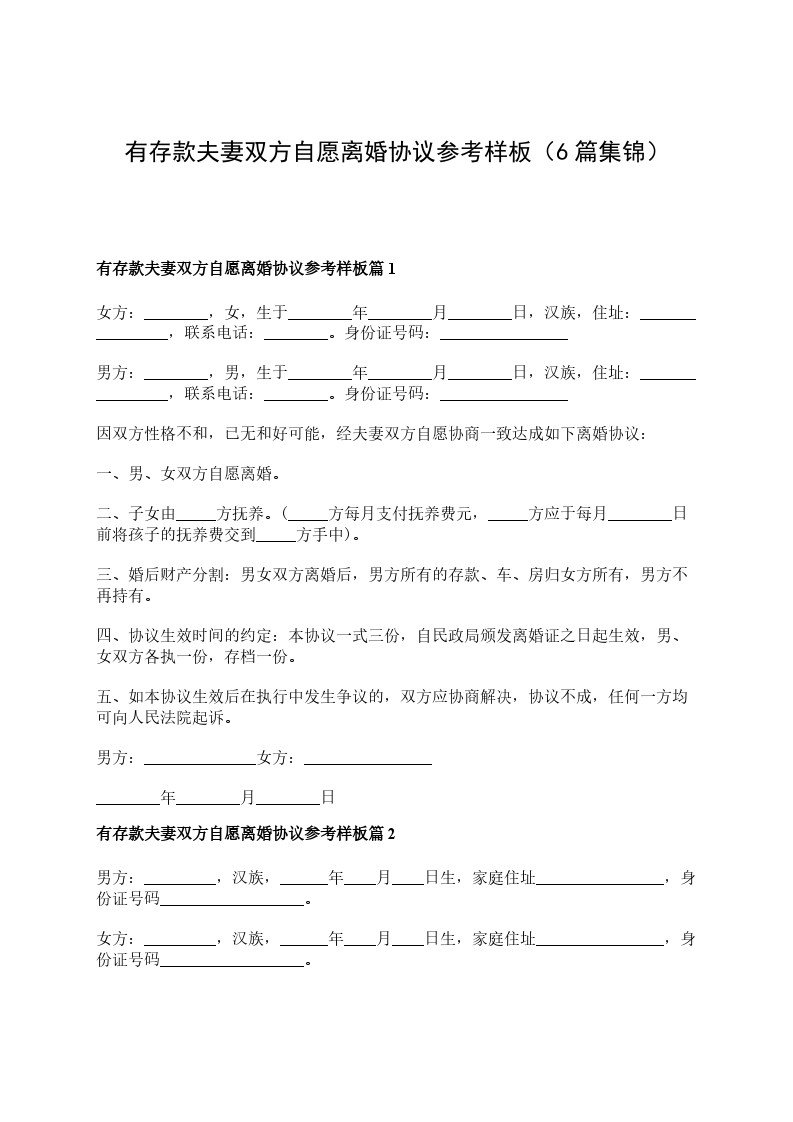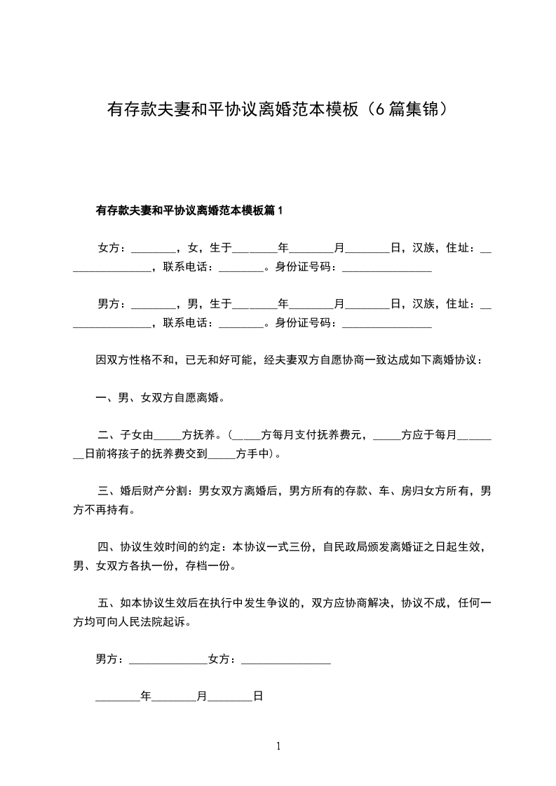 1.存款:双方名下现有银行存款共元,双方各分一半,为元。分配方式:各自名下的存款保持不变,但男方/女方应于年月日前一次性支付元给女方/男方。