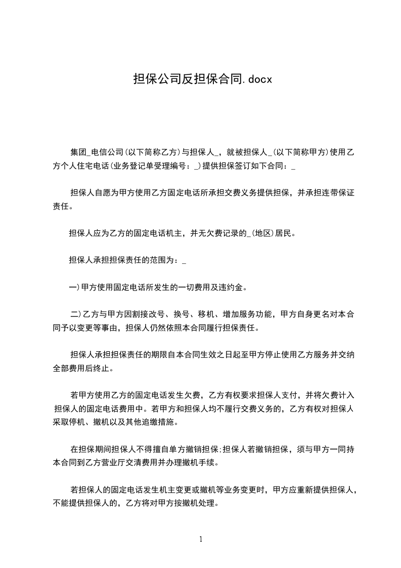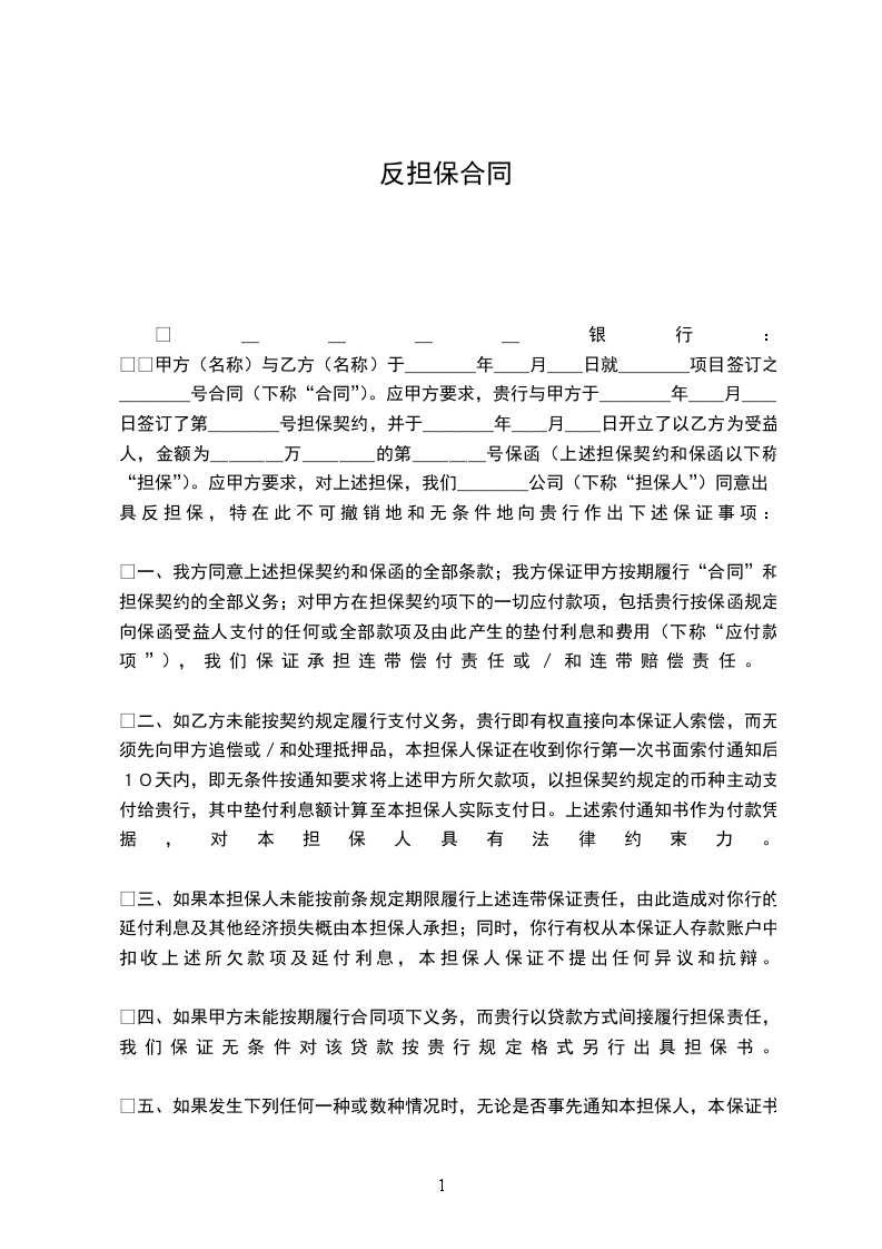 甲方(名称)与乙方(名称)于____年__月__日就____项目签订之____号合同(下称“合同”)。应甲方要求,贵行与甲方于____年__月__日签订了第____号担保契约,并于____年__月__日开立了以乙方为受益人,金额为____万____的第____号保函(上述担保契约和保函以下称“担保”)。应甲方要求,对上述担保,我们____公司(下称“担保人”)同意出具反担保,特在此不可撤销地和无条件地向贵行作出下述保证事项: