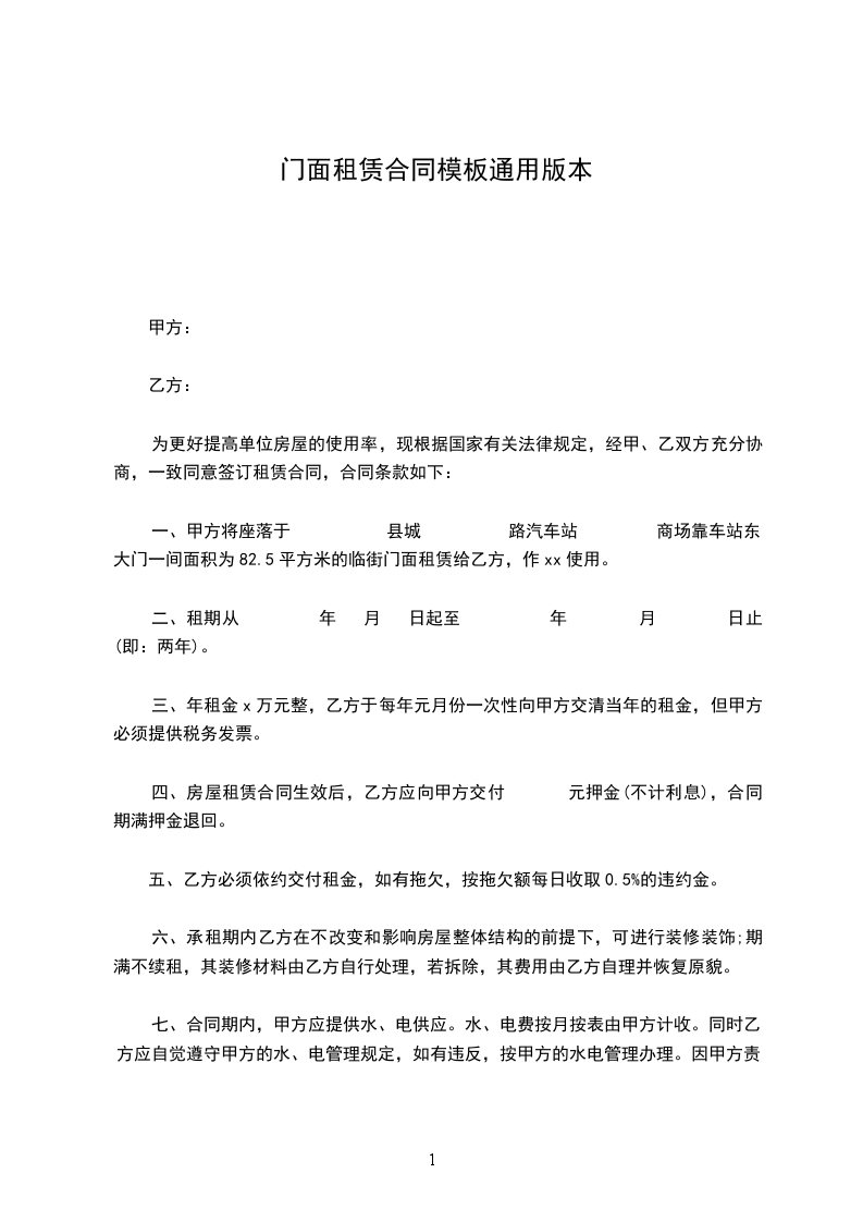 一、甲方将座落于 县城 路汽车站 商场靠车站东大门一间面积为82.5平方米的临街门面租赁给乙方,作xx使用。