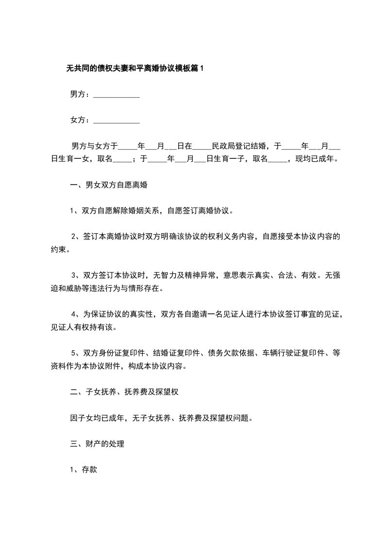 无共同的债权夫妻和平离婚协议模板篇10