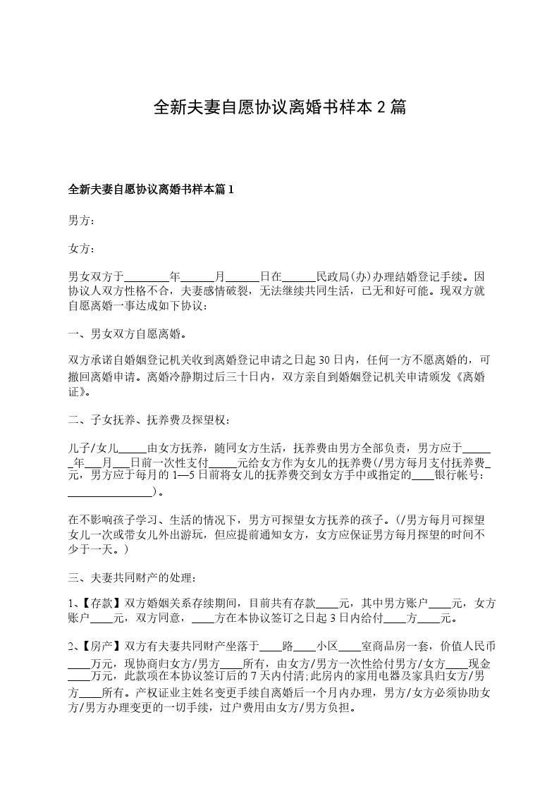 全新夫妻自愿协议离婚书样本篇1