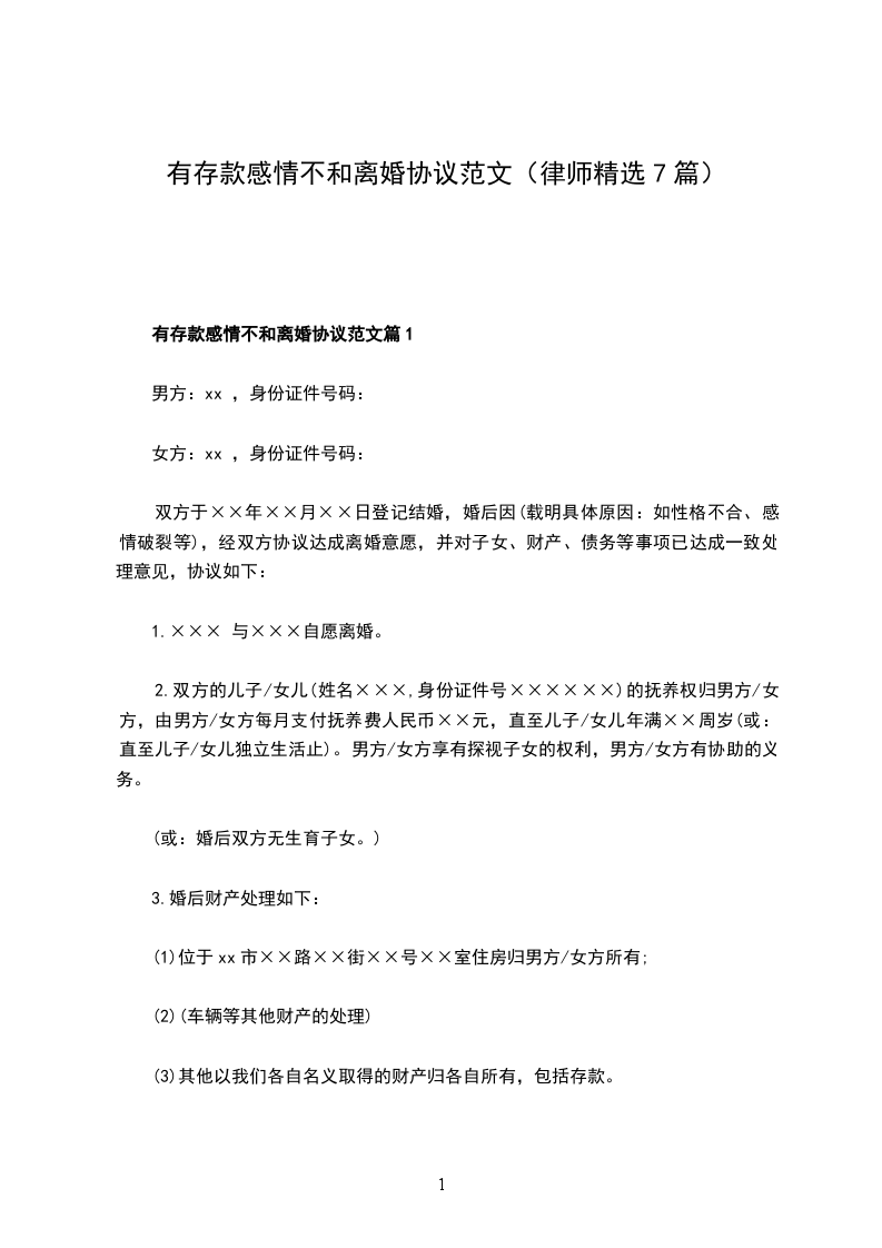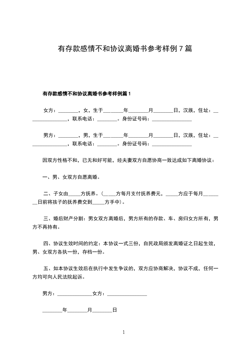 有存款感情不和协议离婚书参考样例篇7