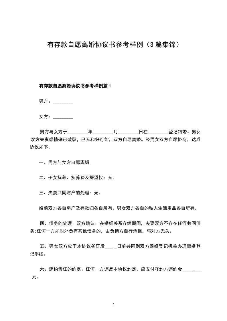 有存款自愿离婚协议参考样例篇1
