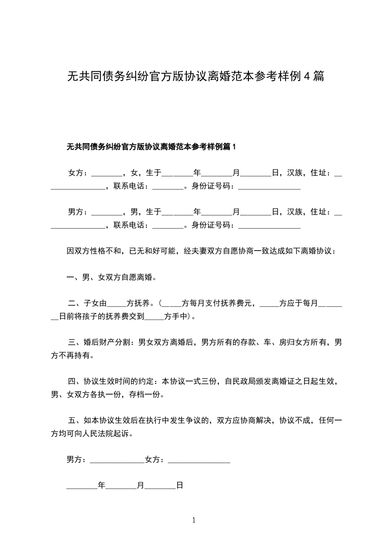 无共同债务纠纷官方版协议离婚范本参考样例篇1