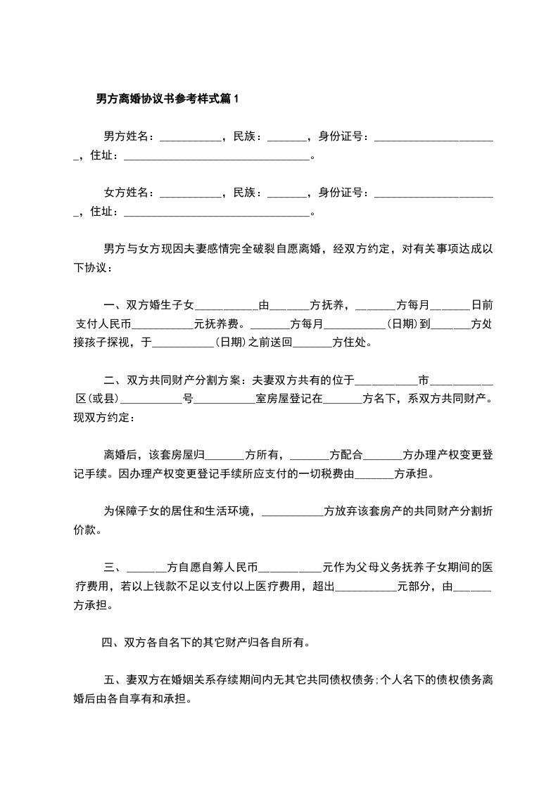 最新男方离婚协议参考样本篇1
