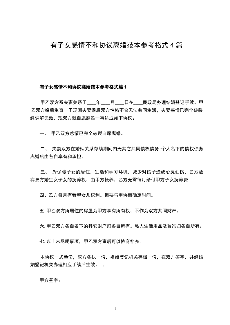 有子女感情不和协议离婚范本参考格式篇1