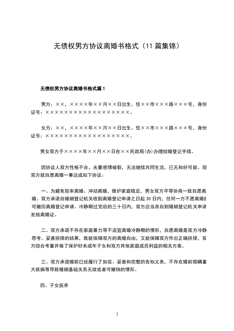 无债权男方协议离婚书格式篇11