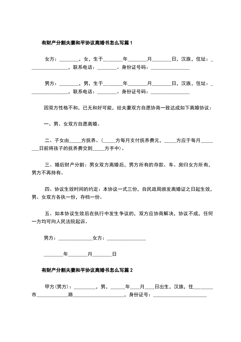 二、 双方共同财产分割方案:夫妻双方共有的位于___________市___________区(或县)___________号___________室房屋登记在_______方名下,系双方共同财产。现双方约定: