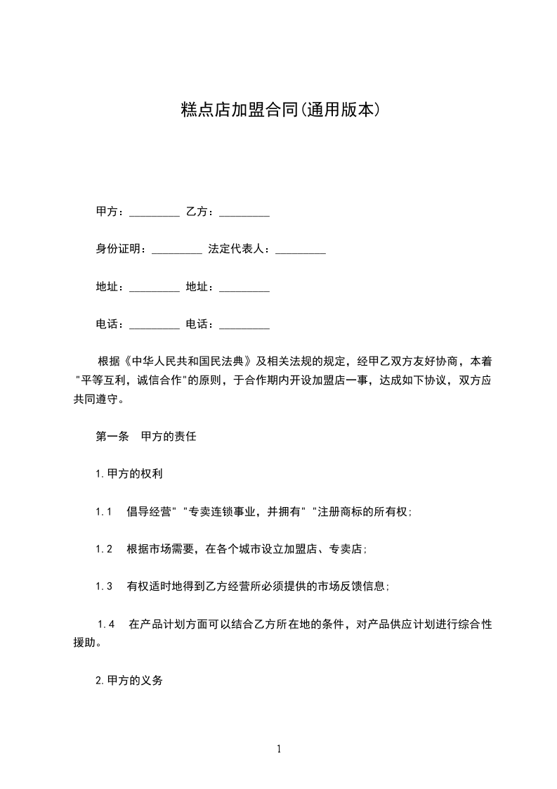 根据《中华人民共和国民法典》及相关法规的规定,经甲乙双方友好协商,本着"平等互利,诚信合作"的原则,于合作期内开设加盟店一事,达成如下协议,双方应共同遵守。