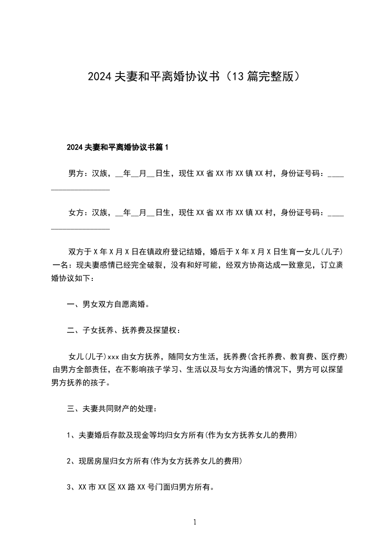1、存款:双方名下现有银行存款共______元,双方各分一半,为______元。分配方式:各自名下的存款保持不变,但男方/女方应于_____年____月____日前一次性支付_____元给女方/男方。