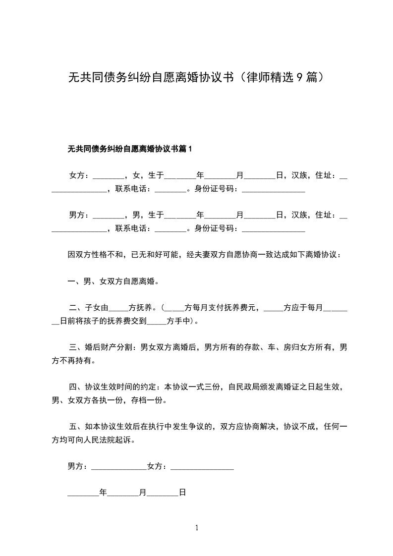 九、本协议一式三份,自婚姻登记处颁发离婚证之日起生效,男、女双方各执一份,婚姻登记机关存档一份。