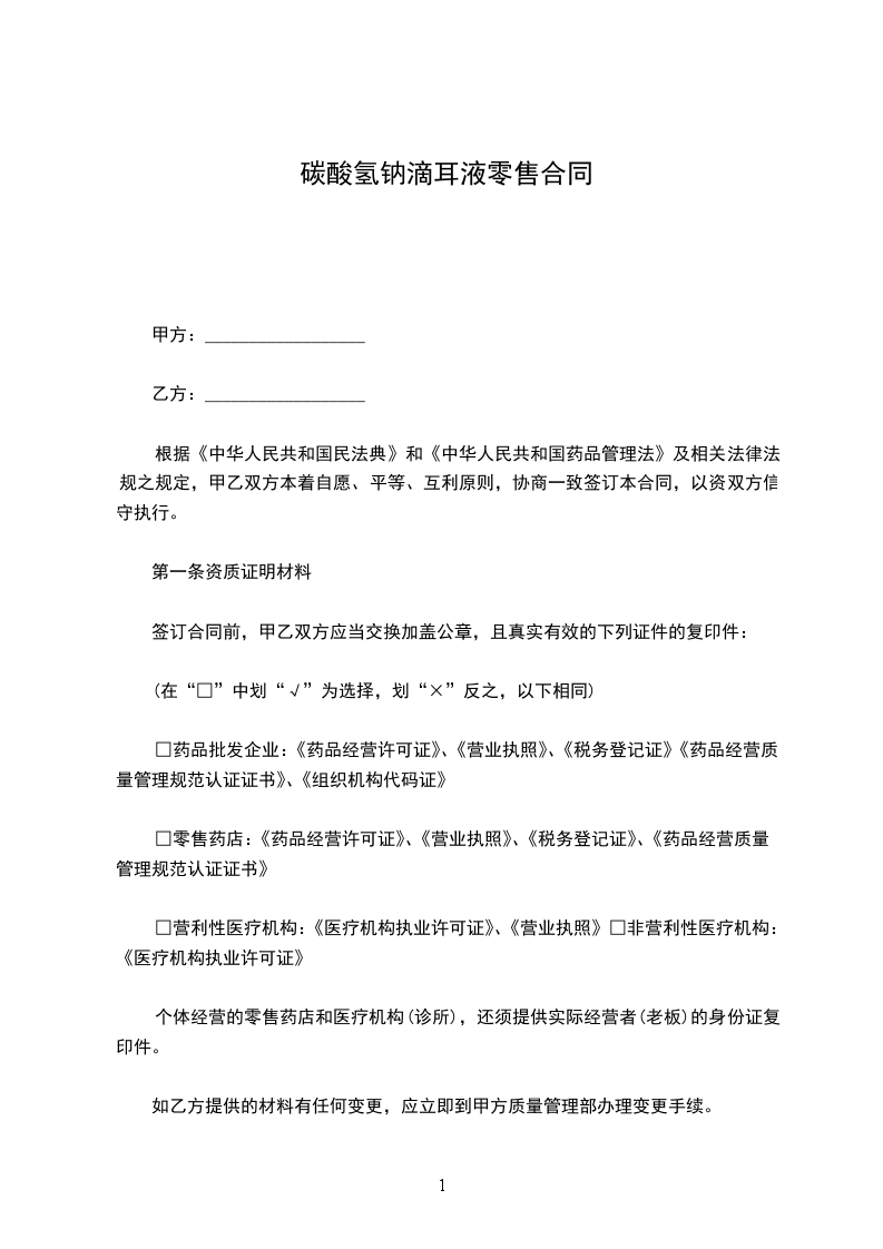 根据《中华人民共和国民法典》,甲、乙双方经协商确定,甲方向乙方购买药品。为明确双方责任和权利,特签订本合同,共同遵守。具体条款如下: