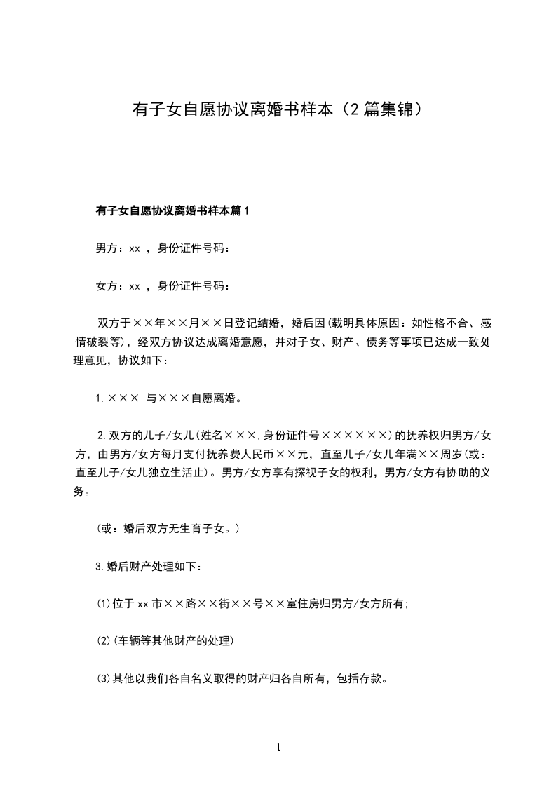 一、______与______自愿离婚。