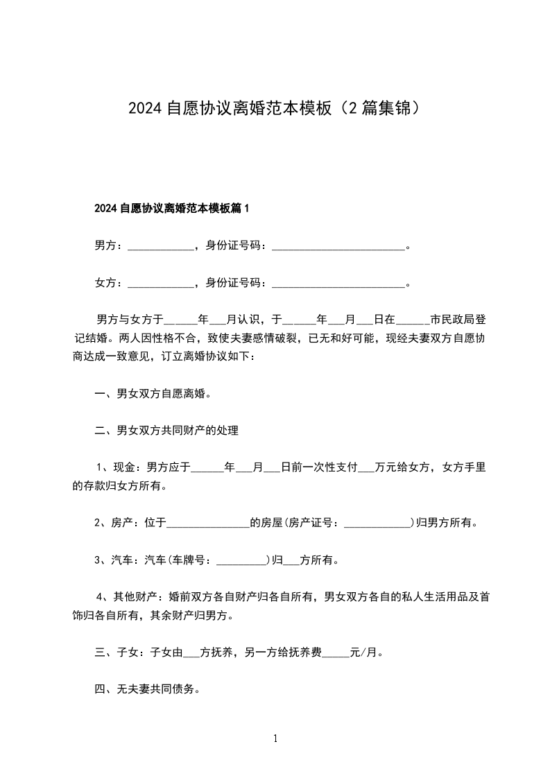 2024自愿协议离婚范本参考样本篇1