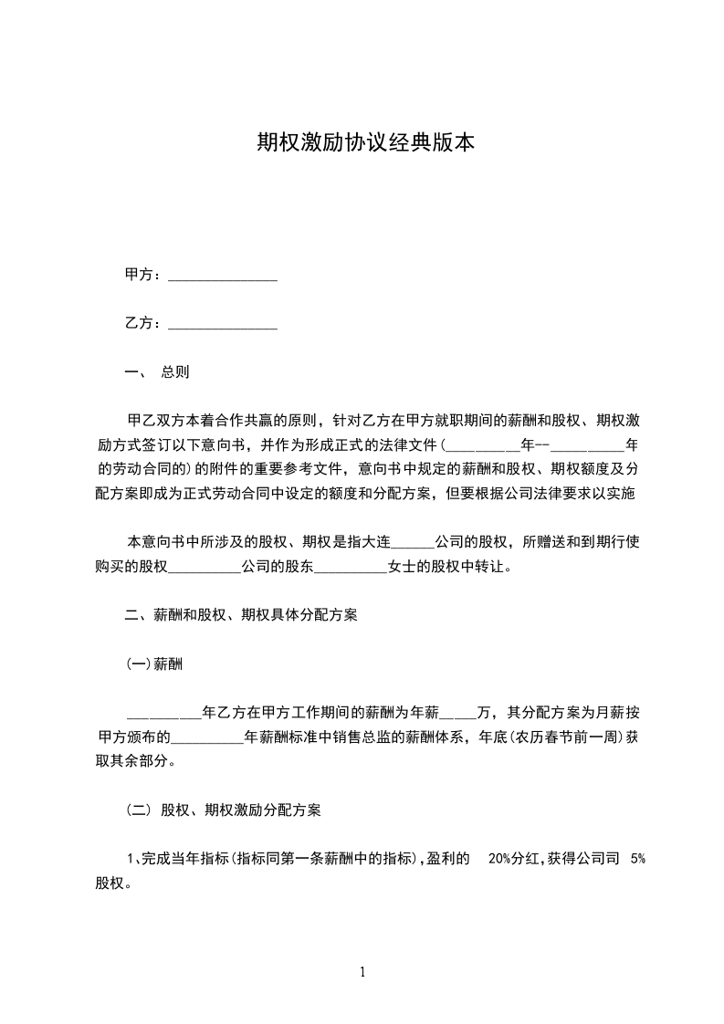 甲乙双方本着合作共赢的原则,针对乙方在甲方就职期间的薪酬和股权、期权激励方式签订以下意向书,并作为形成正式的法律文件(__________年--__________年的劳动合同的)的附件的重要参考文件,意向书中规定的薪酬和股权、期权额度及分配方案即成为正式劳动合同中设定的额度和分配方案,但要根据公司法律要求以实施。