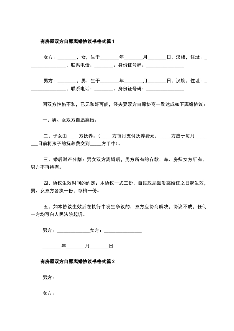 2、【房产】双方有夫妻共同财产坐落于____路____小区____室商品房一套,价值人民币____万元,现协商归女方/男方____所有,由女方/男方一次性给付男方/女方____现金____万元,此款项在本协议签订后的7天内付清;此房内的家用电器及家具归女方/男方____所有。产权证业主姓名变更手续自离婚后一个月内办理,男方/女方必须协助女方/男方办理变更的一切手续,过户费用由女方/男方负担。