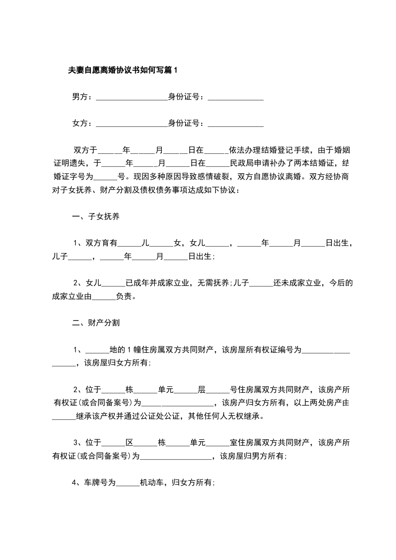 男方与女方于____年__月__日登记结婚。现因__自愿解除婚姻关系,经双方协商订立离婚协议如下: