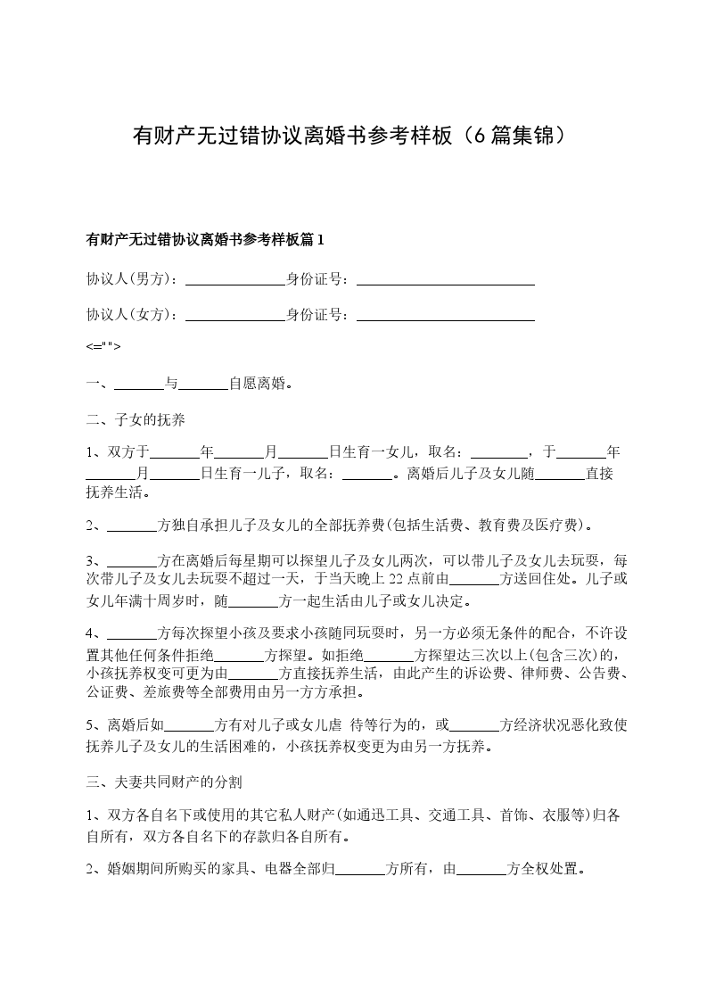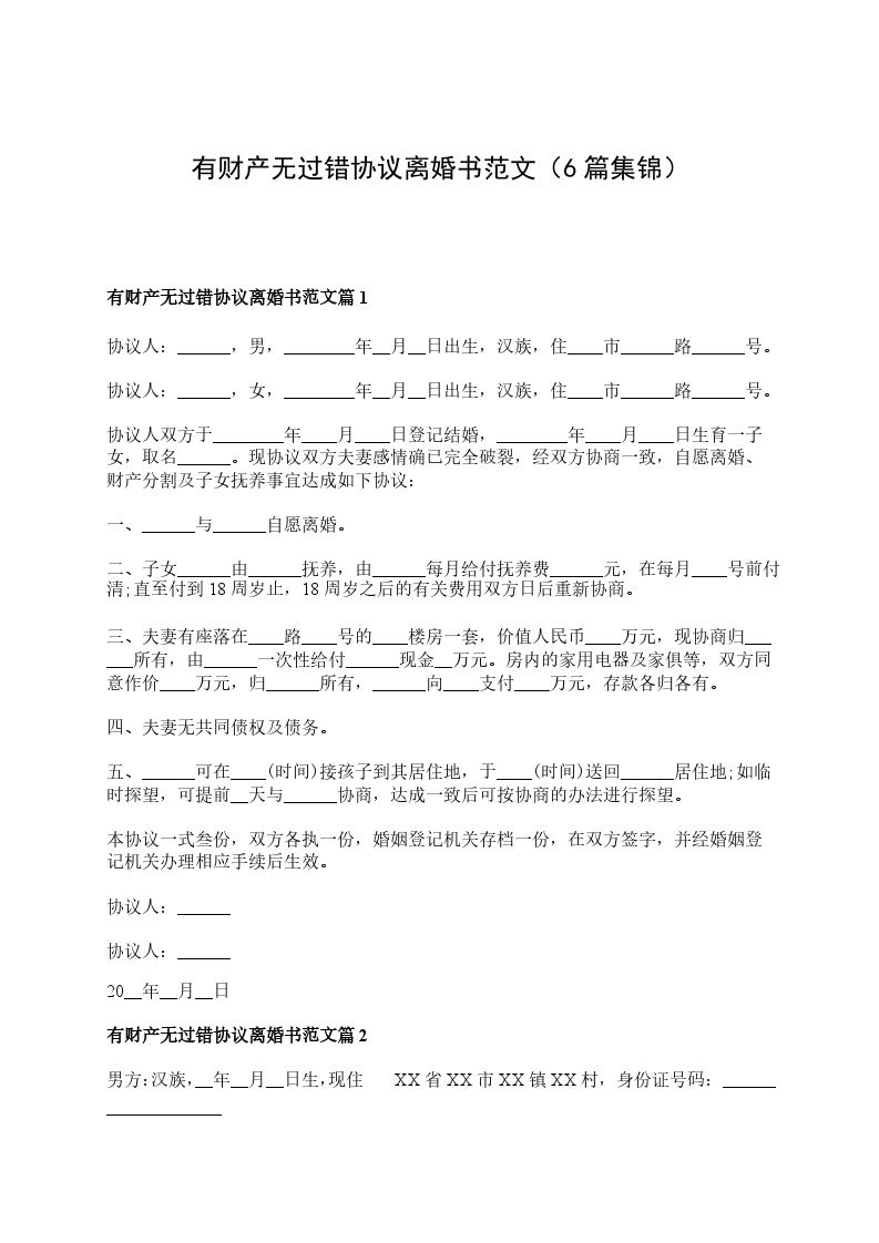 有财产无过错协议离婚书范文篇6