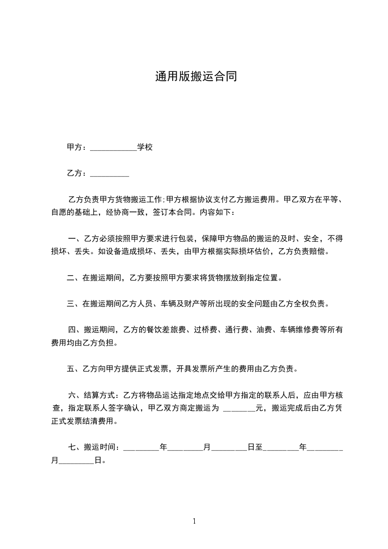 六、结算方式:乙方将物品运达指定地点交给甲方指定的联系人后,应由甲方核查,指定联系人签字确认,甲乙双方商定搬运为 ________元,搬运完成后由乙方凭正式发票结清费用。