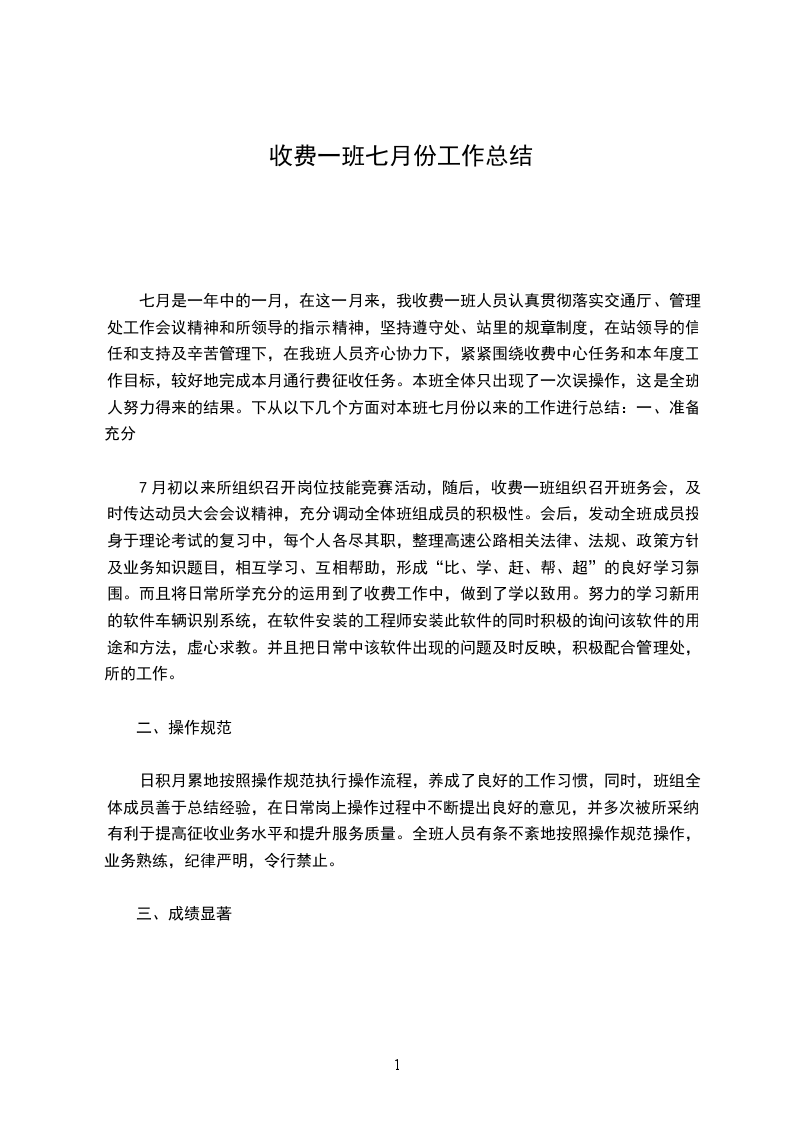 七月是一年中的一月,在这一月来,我收费一班人员认真贯彻落实交通厅、管理处工作会议精神和所领导的指示精神,坚持遵守处、站里的规章制度,在站领导的信任和支持及辛苦管理下,在我班人员齐心协力下,紧紧围绕收费中心任务和本年度工作目标,较好地完成本月通行费征收任务。本班全体只出现了一次误操作,这是全班人努力得来的结果。下从以下几个方面对本班七月份以来的工作进行总结:一、准备充分