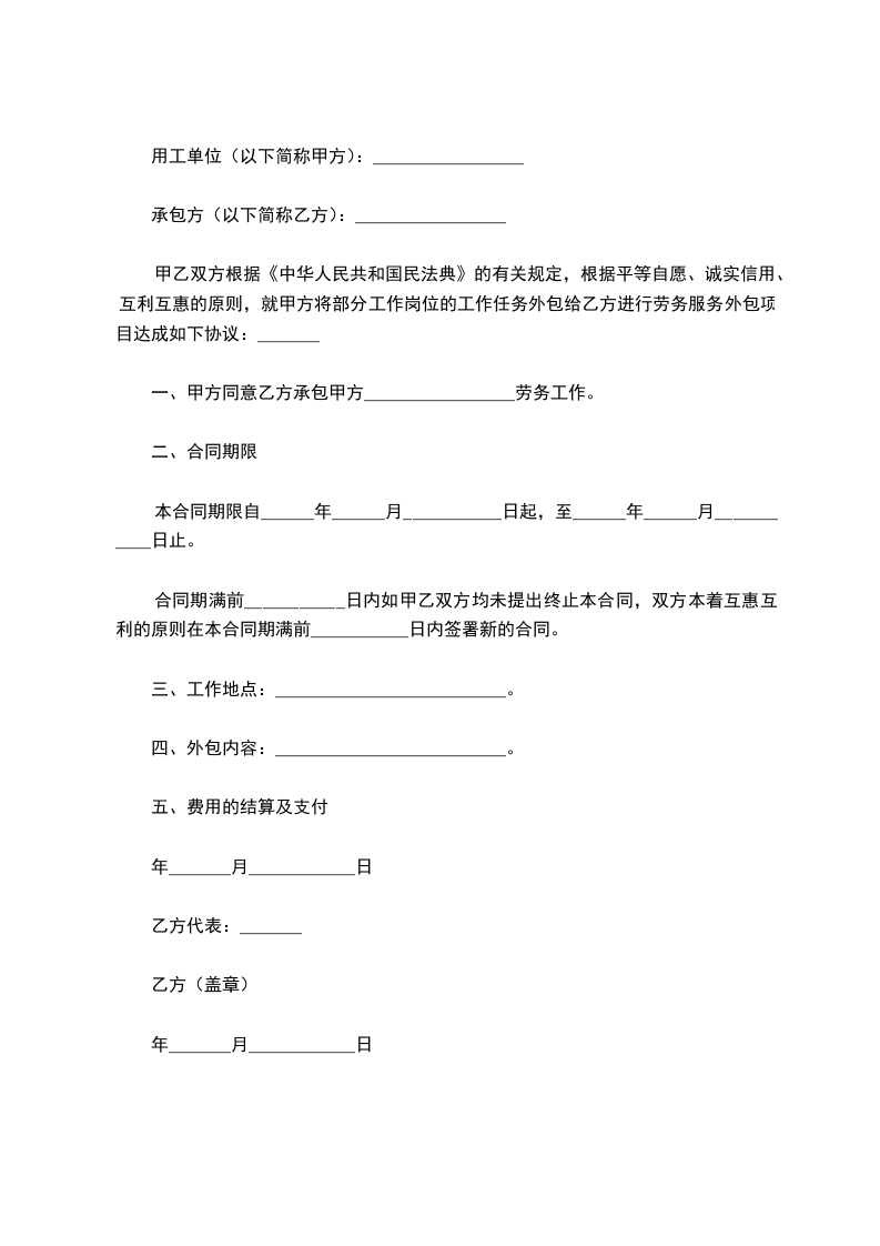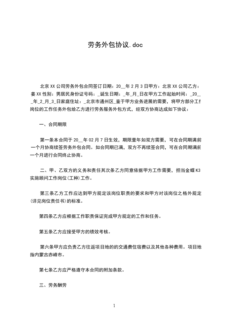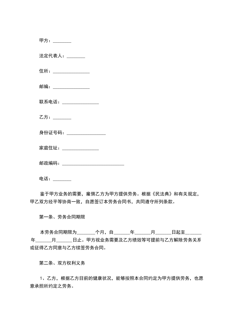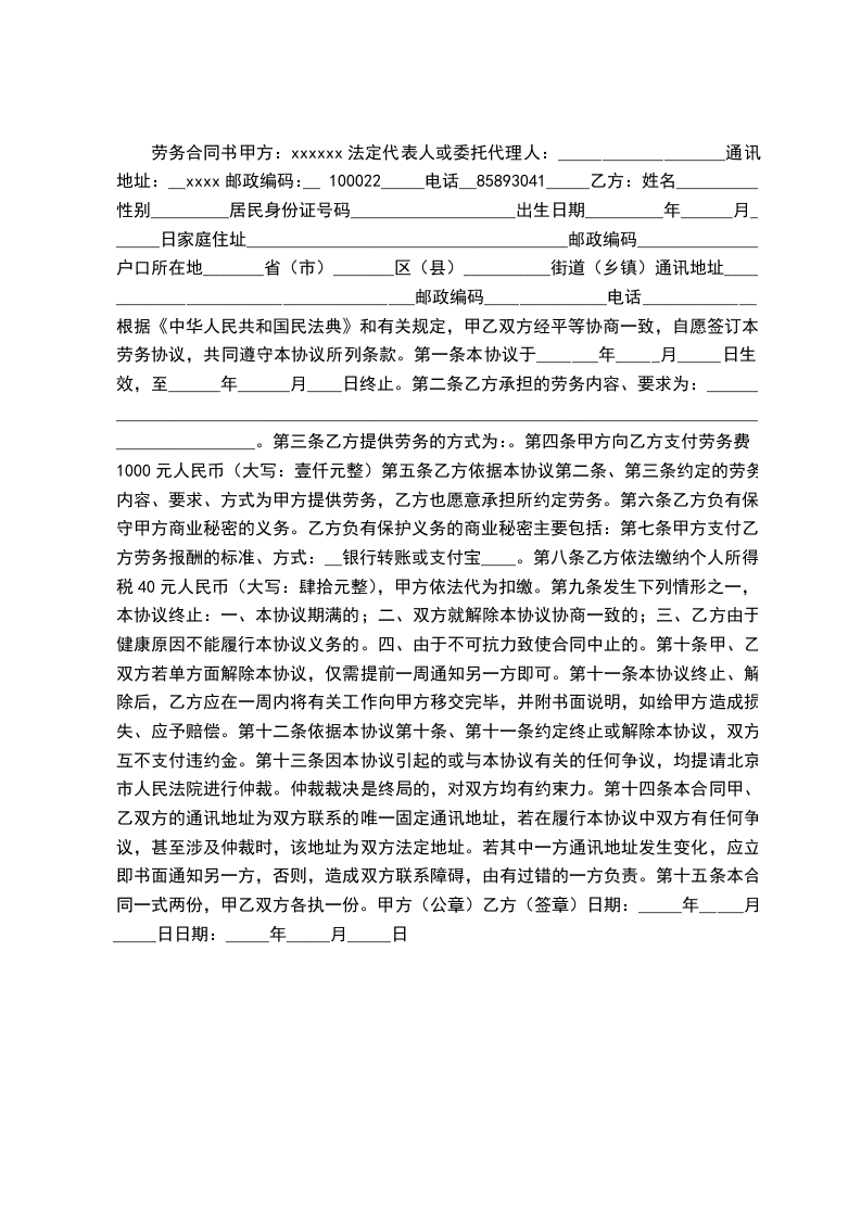 劳务合同书甲方:xxxxxx法定代表人或委托代理人:___________________通讯地址:__xxxx邮政编码:__100022_____电话__85893041_____乙方:姓名__________性别_________居民身份证号码___________________出生日期_________年______月______日家庭住址_____________________________________邮政编码______________户口所在地_______省(市)_______区(县)__________街道(乡镇)通讯地址______________________________________邮政编码______________电话_____________根据《中华人民共和国民法典》和有关规定,甲乙双方经平等协商一致,自愿签订本劳务协议,共同遵守本协议所列条款。第一条本协议于_______年_____月_____日生效,至______年______月____日终止。第二条乙方承担的劳务内容、要求为:________________________________________________________________________________________________。第三条乙方提供劳务的方式为:。第四条甲方向乙方支付劳务费1000元人民币(大写:壹仟元整)第五条乙方依据本协议第二条、第三条约定的劳务内容、要求、方式为甲方提供劳务,乙方也愿意承担所约定劳务。第六条乙方负有保守甲方商业秘密的义务。乙方负有保护义务的商业秘密主要包括:第七条甲方支付乙方劳务报酬的标准、方式:__银行转账或支付宝____。第八条乙方依法缴纳个人所得税40元人民币(大写:肆拾元整),甲方依法代为扣缴。第九条发生下列情形之一,本协议终止:一、本协议期满的;二、双方就解除本协议协商一致的;三、乙方由于健康原因不能履行本协议义务的。四、由于不可抗力致使合同中止的。第十条甲、乙双方若单方面解除本协议,仅需提前一周通知另一方即可。第十一条本协议终止、解除后,乙方应在一周内将有关工作向甲方移交完毕,并附书面说明,如给甲方造成损失、应予赔偿。第十二条依据本协议第十条、第十一条约定终止或解除本协议,双方互不支付违约金。第十三条因本协议引起的或与本协议有关的任何争议,均提请北京市人民法院进行仲裁。仲裁裁决是终局的,对双方均有约束力。第十四条本合同甲、乙双方的通讯地址为双方联系的唯一固定通讯地址,若在履行本协议中双方有任何争议,甚至涉及仲裁时,该地址为双方法定地址。若其中一方通讯地址发生变化,应立即书面通知另一方,否则,造成双方联系障碍,由有过错的一方负责。第十五条本合同一式两份,甲乙双方各执一份。甲方(公章)乙方(签章)日期:_____年_____月_____日日期:_____年_____月_____日