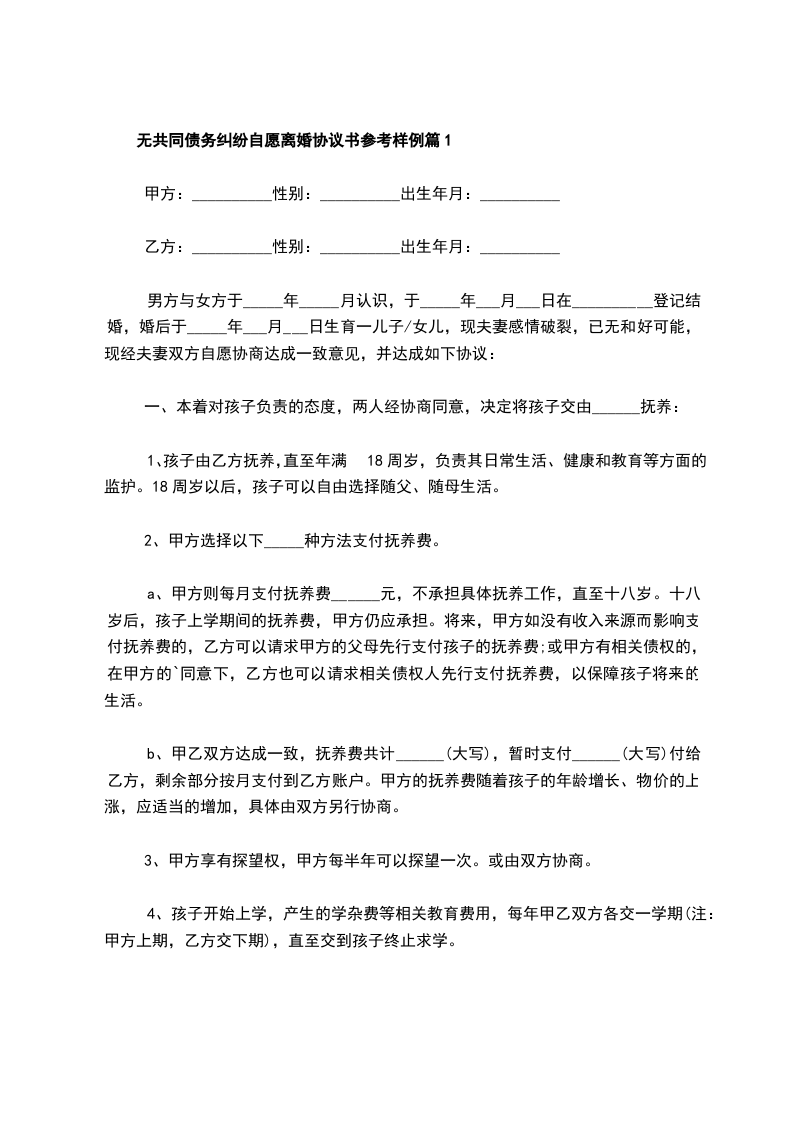双方确认在婚姻关系存续期间没有发生任何共同债务,任何一方如对外负有债务的,由负债方自行承担。