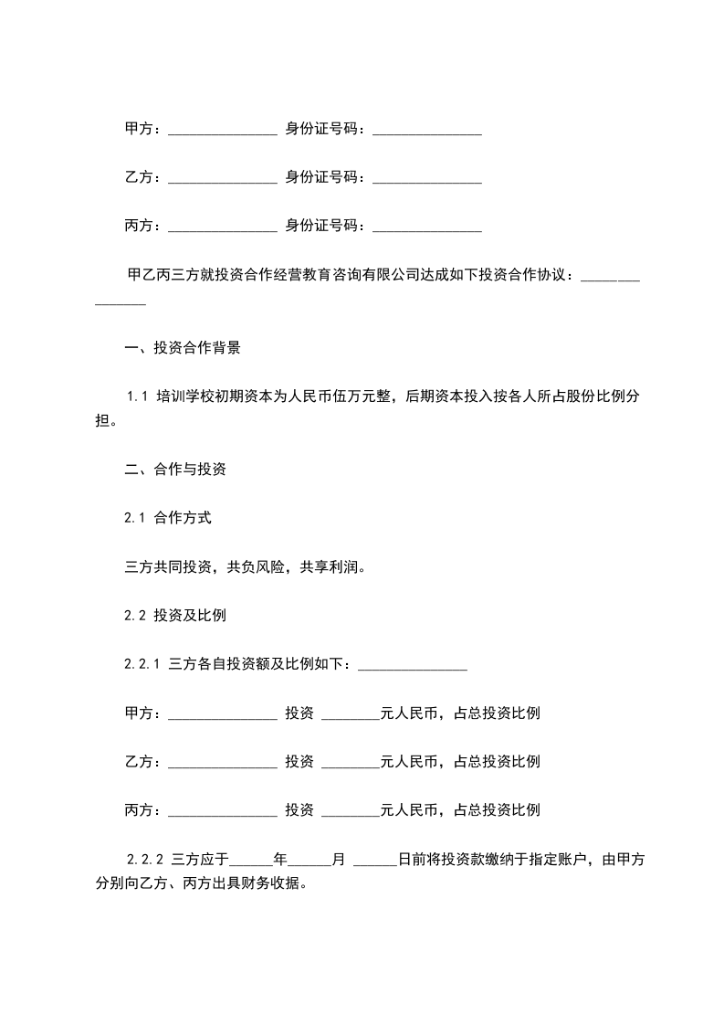 2.2.2 三方应于______年______月 ______日前将投资款缴纳于指定账户,由甲方分别向乙方、丙方出具财务收据。