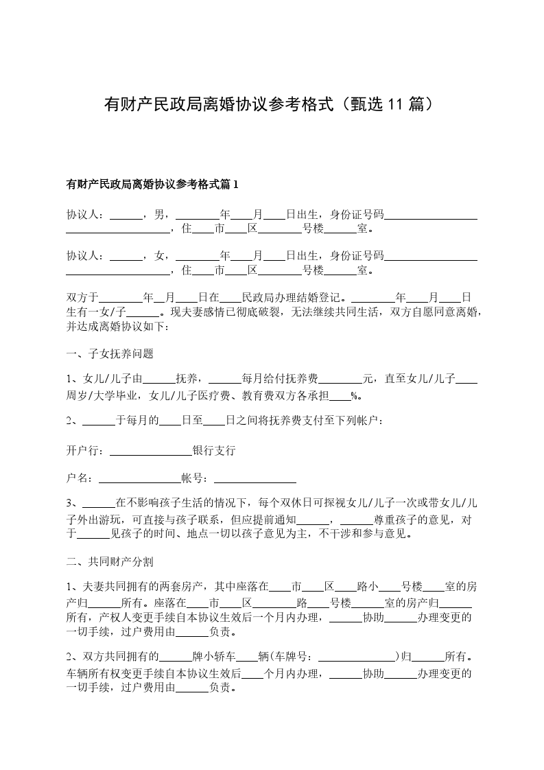 九、本协议一式________份,自婚姻登记处颁发离婚证之日起生效,男、女双方各执________份,婚姻登记机关存档一份。