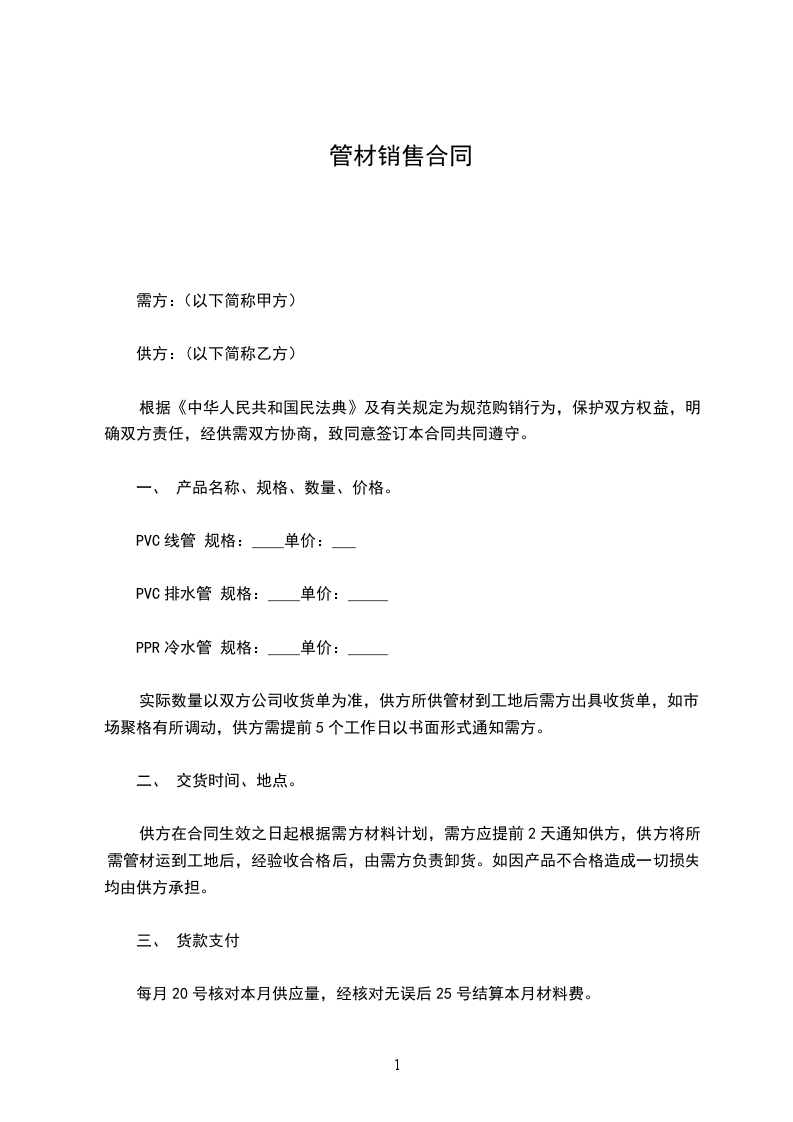 供方在合同生效之日起根据需方材料计划,需方应提前2天通知供方,供方将所需管材运到工地后,经验收合格后,由需方负责卸货。如因产品不合格造成一切损失均由供方承担。