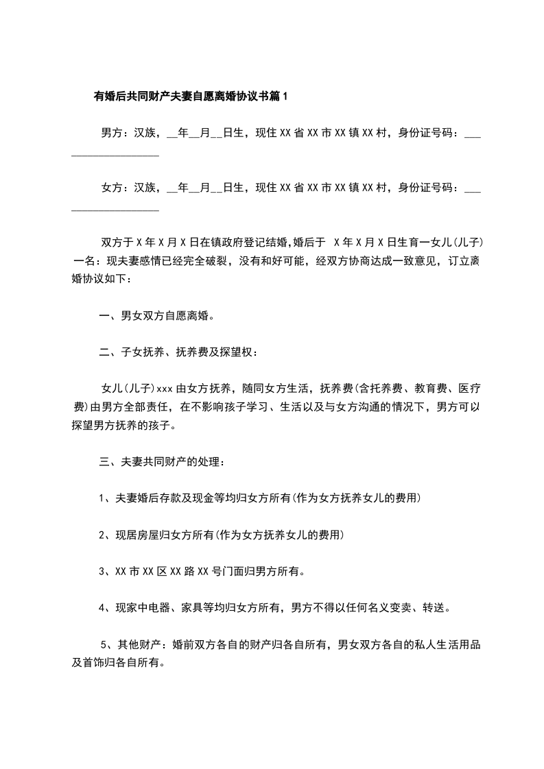 有婚后共同财产夫妻自愿离婚协议书篇2