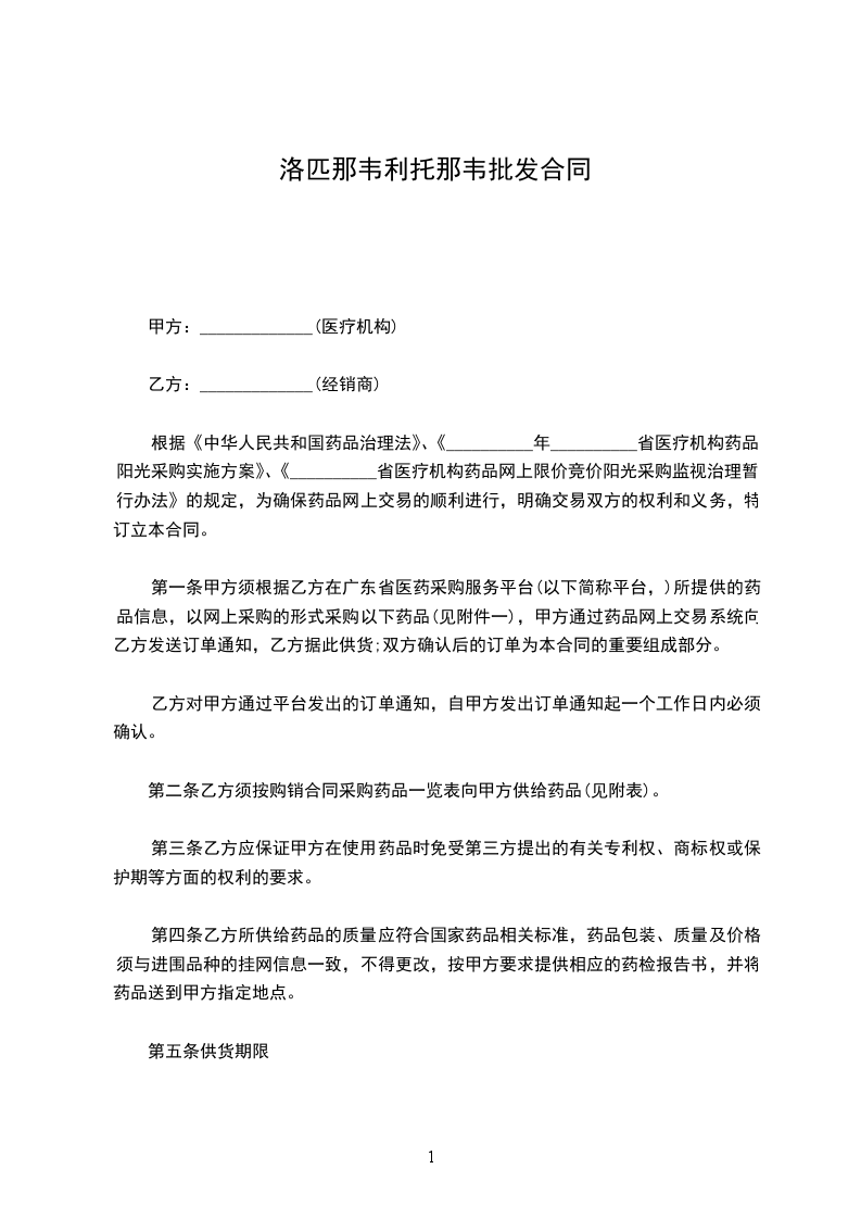 第一条甲方须根据乙方在__________________省医药采购服务平台(以下简称“平台”)所提供的药品信息,以网上采购的形式采购以下药品(见附表,略),甲方通过药品网上交易系统向乙方发送订单通知,乙方据此供货;双方确认后的订单为本合同的重要组成部分。