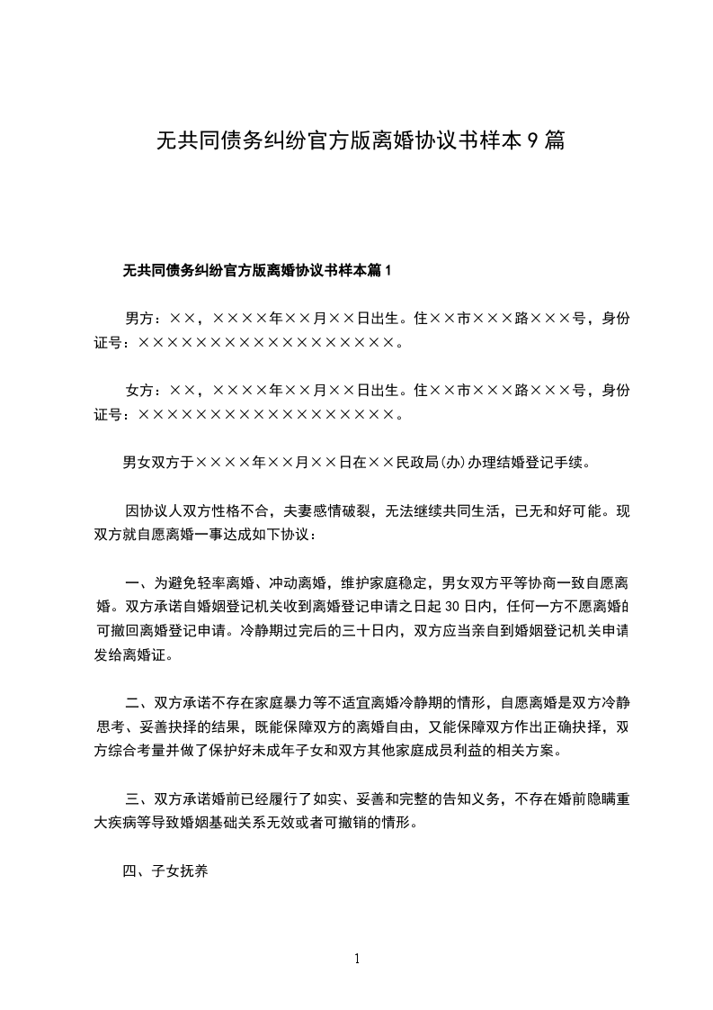 八、本协议一式三份,男、女双方各执一份,婚姻登记机关存档一份,自婚姻登记机颁发《离婚证》之日起生效。九、如本协议生效后在执行中发生争议的,双方应协商解决,协商不成,任何一方均可向相关人民法院起诉。
