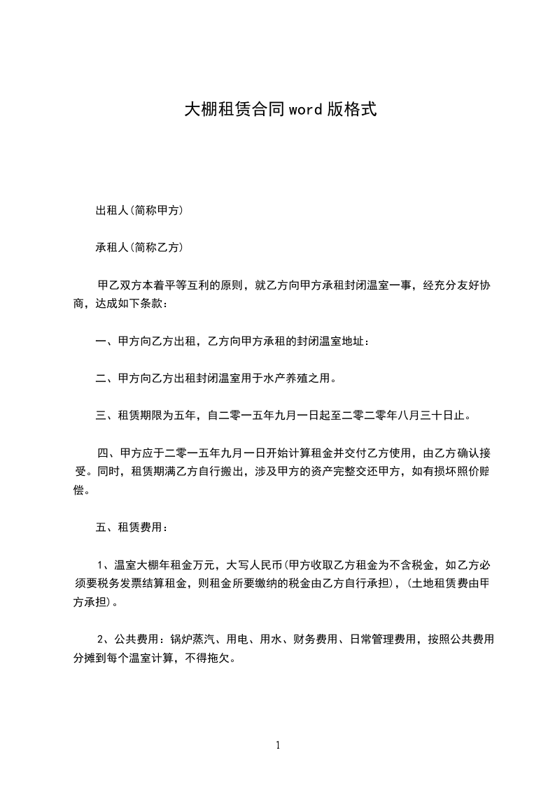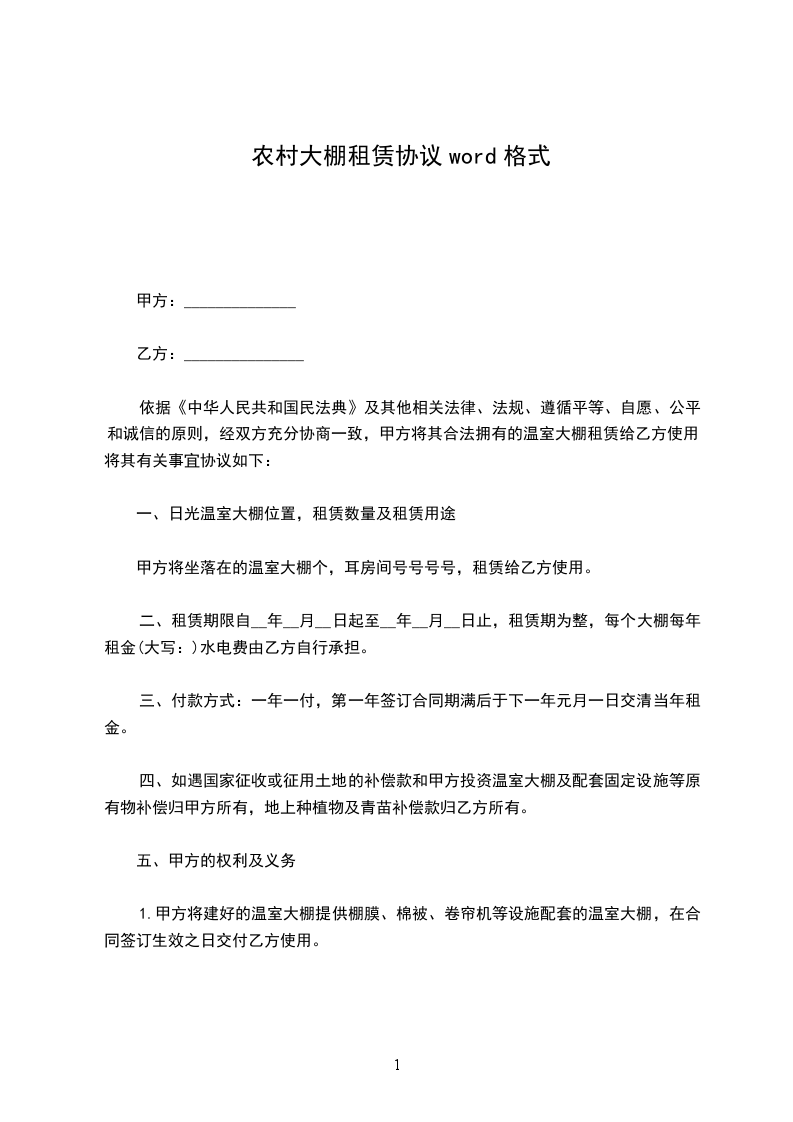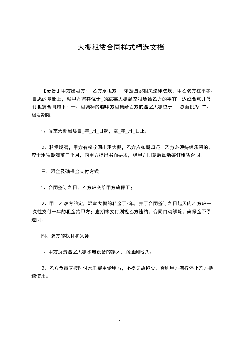 1、温室大棚租赁自____年____月____日起,至____年____月____日止。