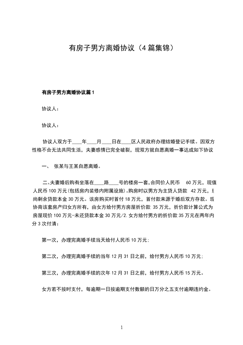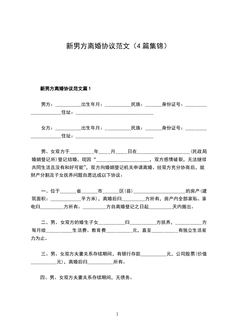 男方与女方于_________年_________月_________日在_________登记结婚。男女双方夫妻感情确已破裂,已无和好可能,双方自愿离婚。经男女双方自愿协商,达成协议如下: