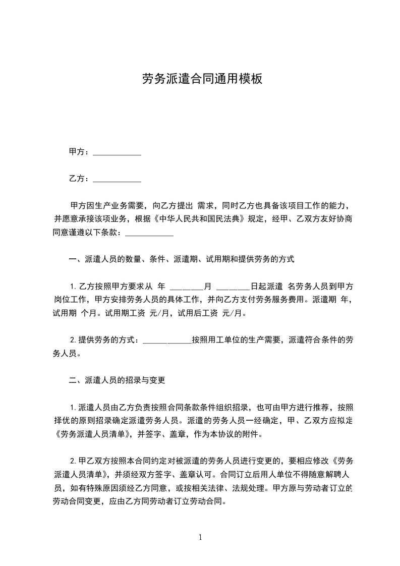 1.乙方按照甲方要求从 年 ________月 ________日起派遣 名劳务人员到甲方 岗位工作,甲方安排劳务人员的具体工作,并向乙方支付劳务服务费用。派遣期 年,试用期 个月。试用期工资 元/月,试用后工资 元/月。