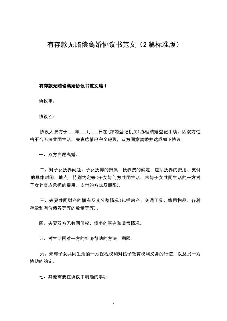 有存款无赔偿离婚协议书范文篇1