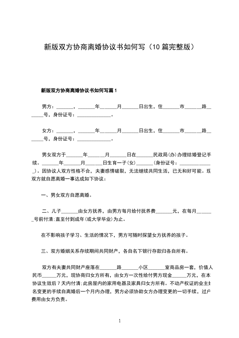 男方__与女方__于____年__月认识,于____年__月__日在__市民政局登记结婚,婚后于____年__月__日生育一儿子,名___。两人因性格不合,致使夫妻感情破裂,已无和好可能,现经夫妻双方自愿协商达成一致意见,订立离婚协议如下: