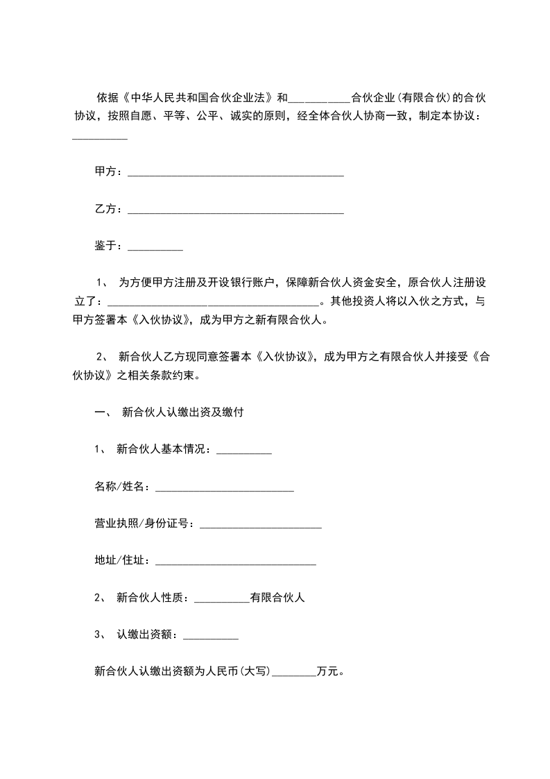 二、 乙方签署本《入伙协议》即成为甲方之有限合伙人。新合伙人应按照甲方普通合伙人之书面指令,于____年_____月____日前,将其认缴出资额人民币(大写)________万元支付至甲方开立的银行账户:__________