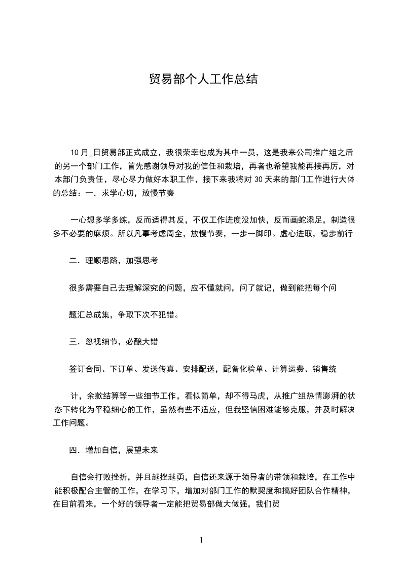 10月_日贸易部正式成立,我很荣幸也成为其中一员,这是我来公司推广组之后的另一个部门工作,首先感谢领导对我的信任和栽培,再者也希望我能再接再厉,对本部门负责任,尽心尽力做好本职工作,接下来我将对30天来的部门工作进行大体的总结:一.求学心切,放慢节奏