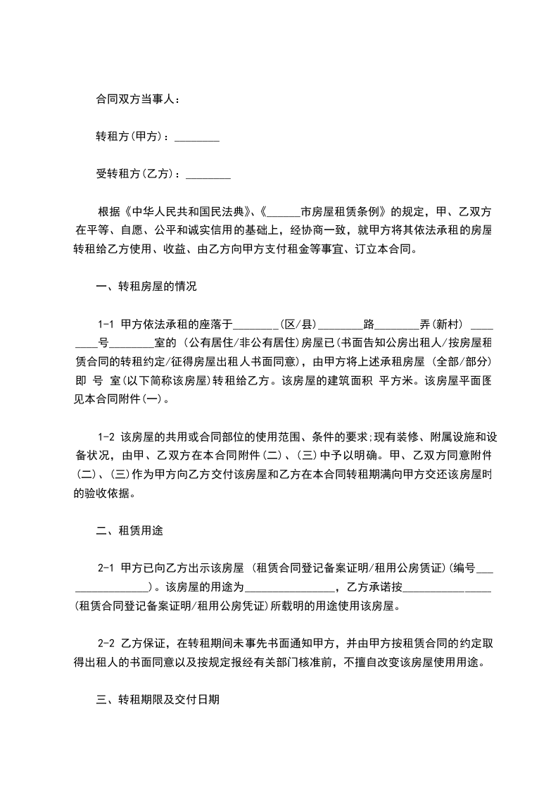 3-1 甲、乙双方约定,甲方于________年 ________月________日前向乙方交付该房屋。转租期为________个月。自________年 ________月 日起至________年 ________月________日止。甲方保证该转租期限未超出________(租赁合同/前一个转租合同)的租期。