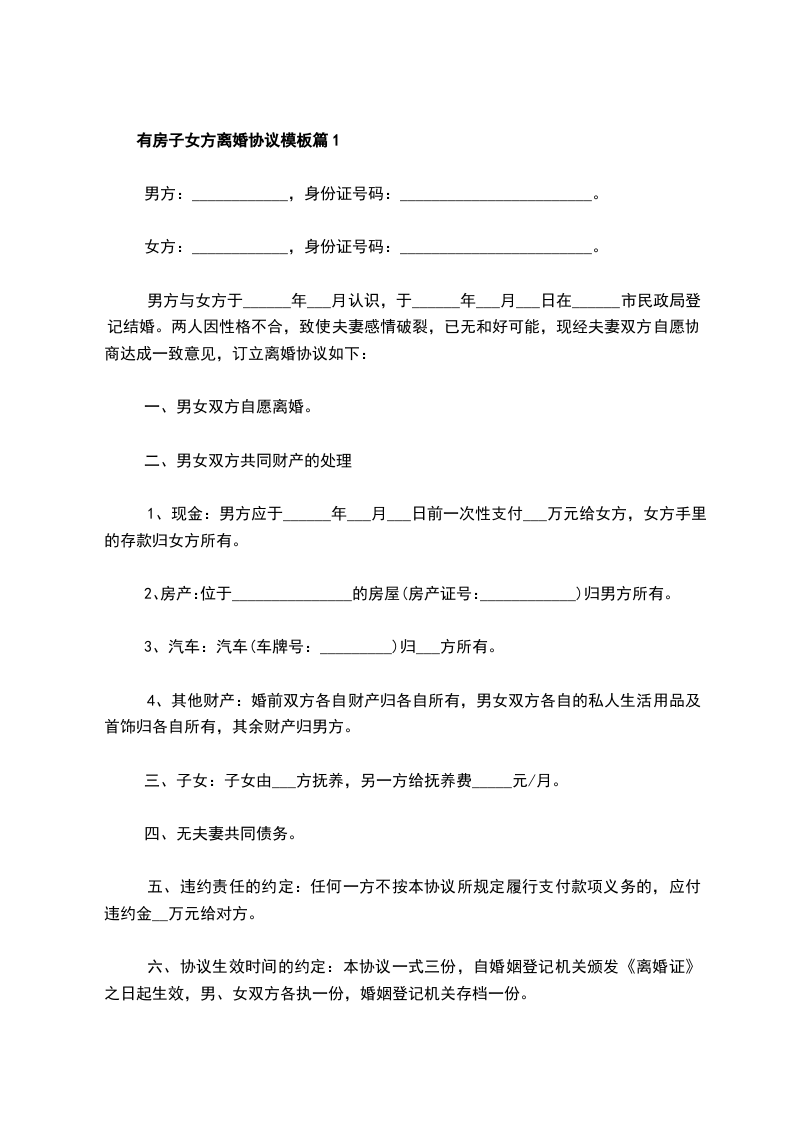 有房子女方离婚协议模板篇1