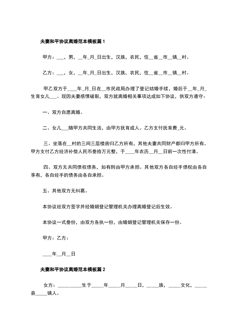 2024年夫妻和平协议离婚范本如何写篇2
